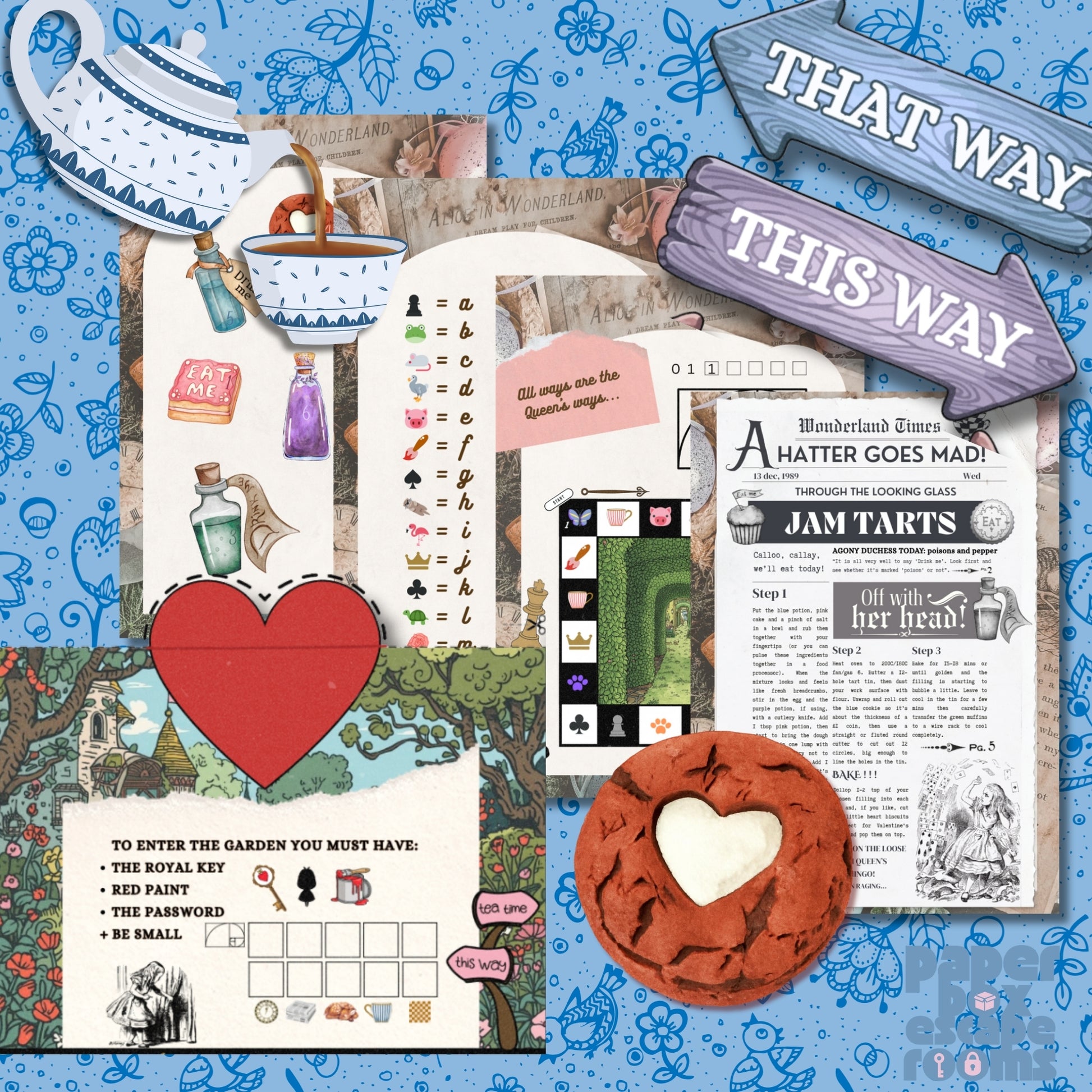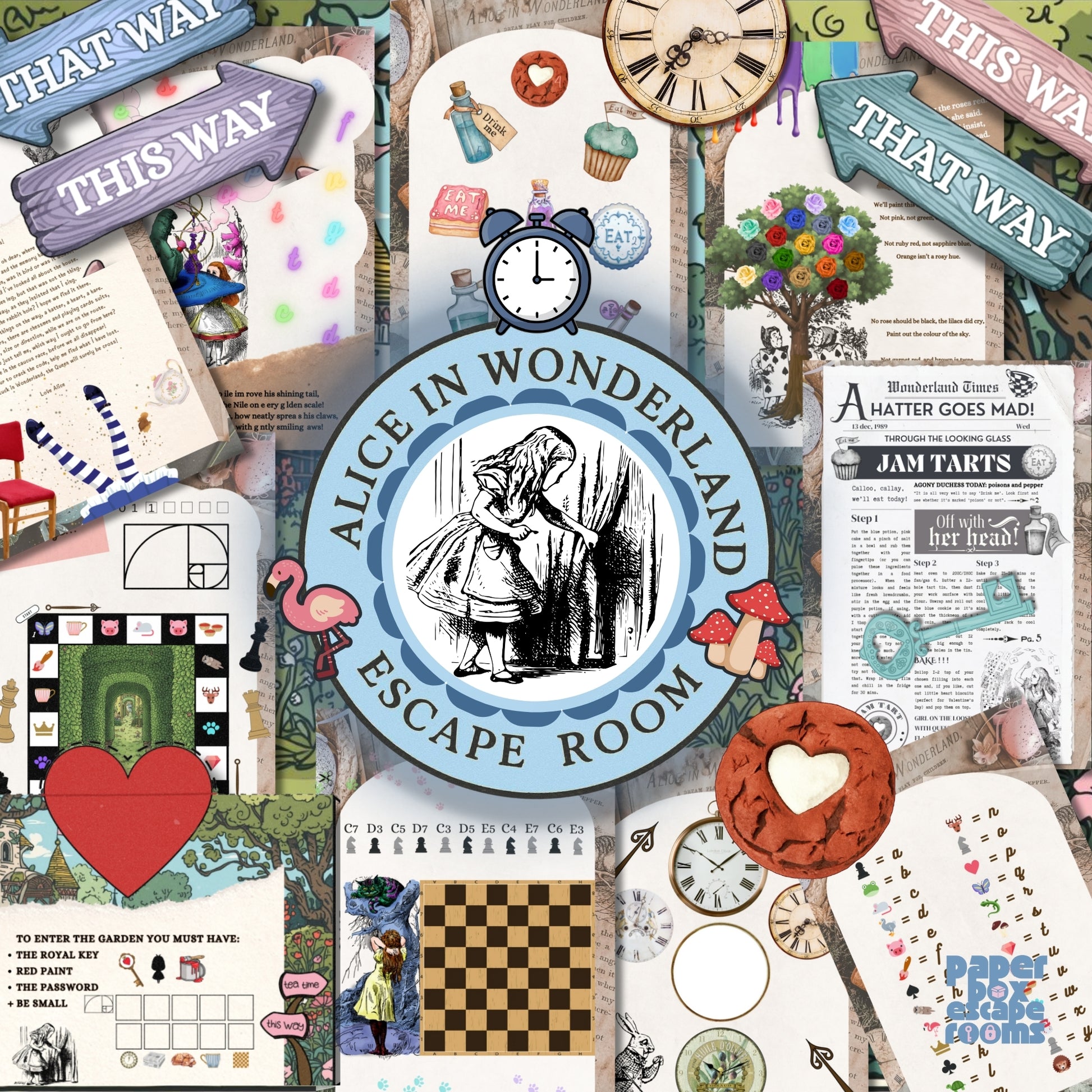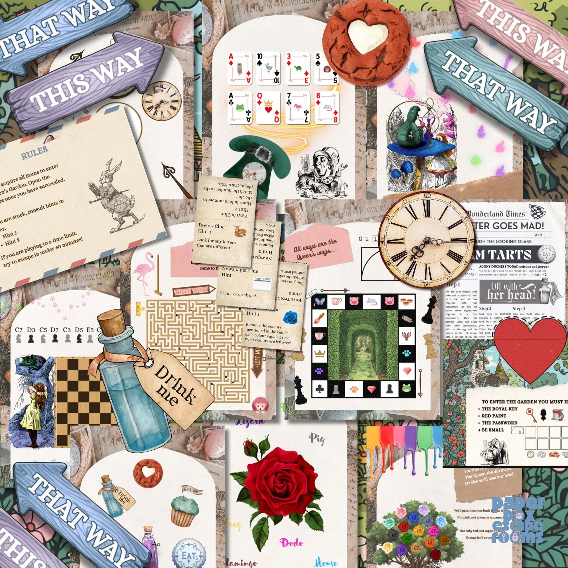 This Alice in Wonderland escape room printable kit takes little prep. Simply print out the PDF document and follow the simple instructions to set up. There is a little cutting and pinning, but it should only take a few minutes to get the party started. There are also some handy ‘hints’ included in case you get stuck on the way and forget which way is up. All the instructions are included, and the players (you may turn big or small in no time at all in this game) will have fun trying to reach the end before the time runs out. The Alice at home escape room would also make a wonderful gift for anyone who loves the book, or simply can't get enough escape rooms.