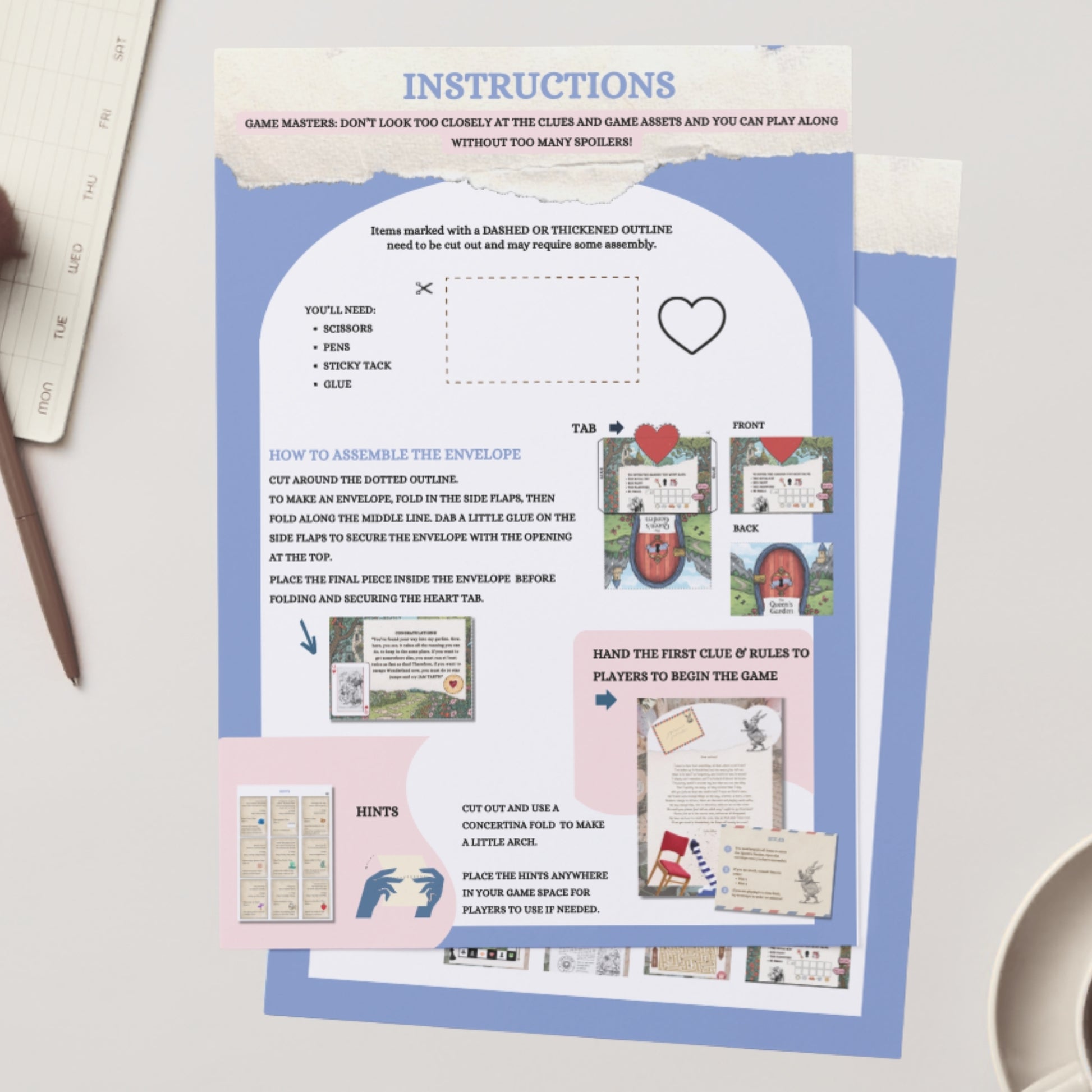 ✂️ SET-UP The game is designed to need minimal set-up. You need nothing more than paper, the provided PDF documents, a colour printer, and scissors. You don't need any special equipment, and the person who sets up the game can also join in the fun! You can easily set up the experience in any space: at school, at home, or even at a team building party! Players will move from room to room on the hunt for clues, feeling like they've jumped right into Alice's story.